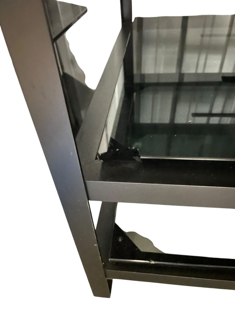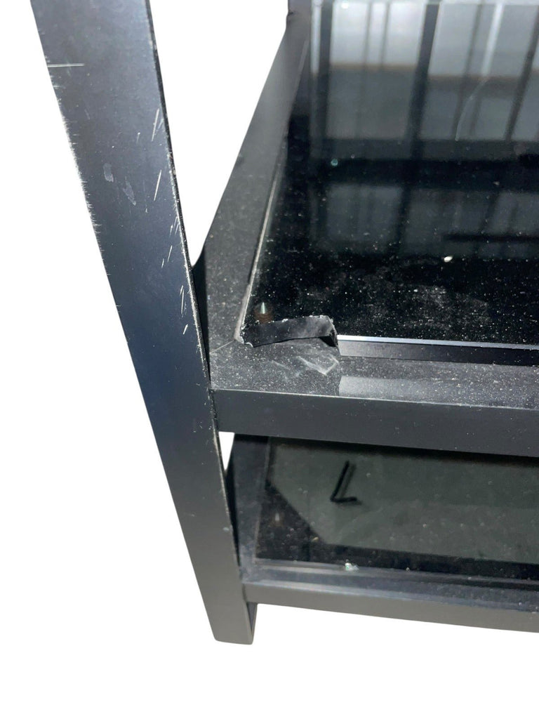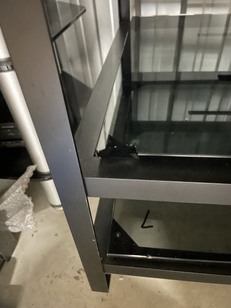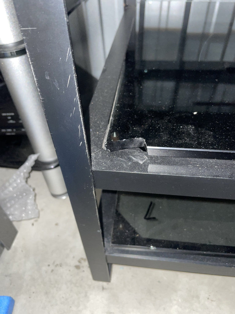 Mana 5 shelf hifi stand rack with metal frame and smoked glass shelves. The metal frame is in good condition. The glass shelves are less good, they have been marked in pen (this could be removed with a solvent), some edges to the glass shelves have been chipped and one shelf has a chunk missing from the corner (see photos). Another shelf has had a plastic piece glued to it to presumably stop a piece of equipment being pushed back too far. Whilst all the shelves appear perfectly functional it seems important to mention the less than good condition of the glass shelves. Collection in person by appointment from our unit in Manchester please.