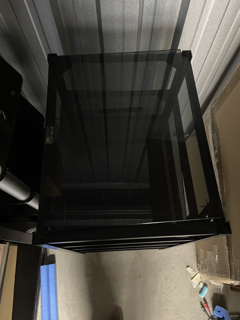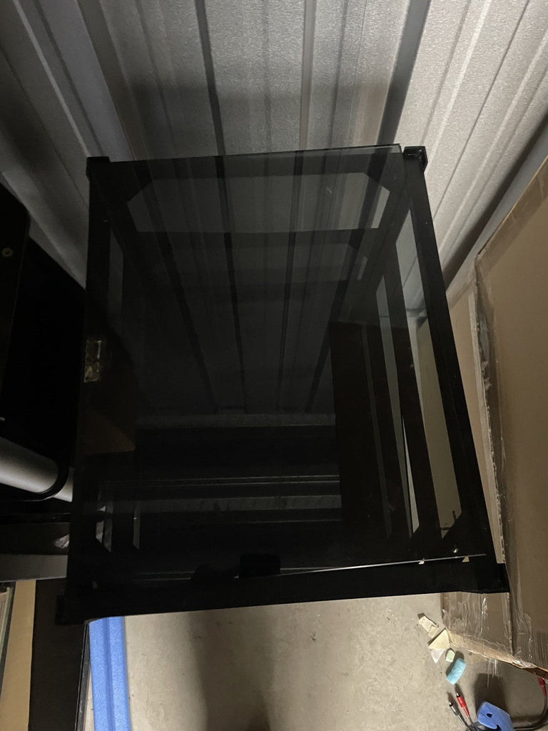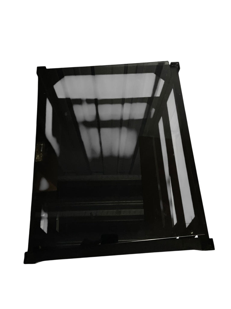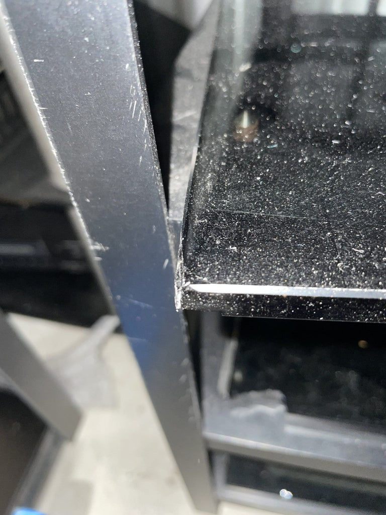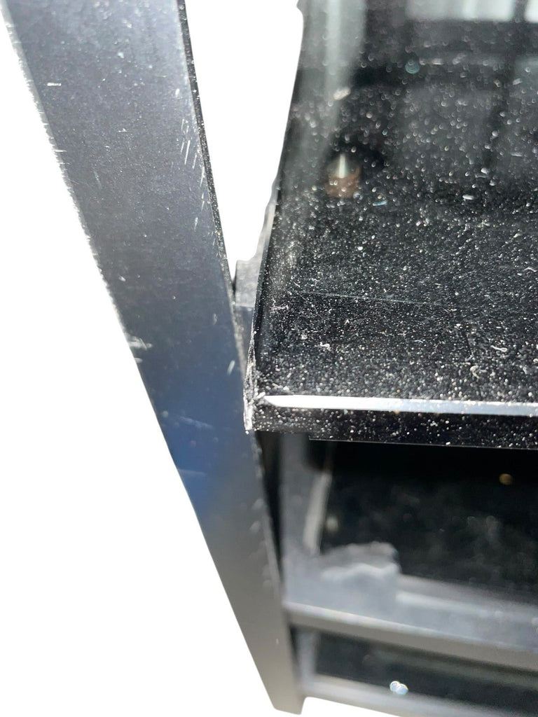 Mana 5 shelf hifi stand rack with metal frame and smoked glass shelves. The metal frame is in good condition. The glass shelves are less good, they have been marked in pen (this could be removed with a solvent), some edges to the glass shelves have been chipped and one shelf has a chunk missing from the corner (see photos). Another shelf has had a plastic piece glued to it to presumably stop a piece of equipment being pushed back too far. Whilst all the shelves appear perfectly functional it seems important to mention the less than good condition of the glass shelves. Collection in person by appointment from our unit in Manchester please.