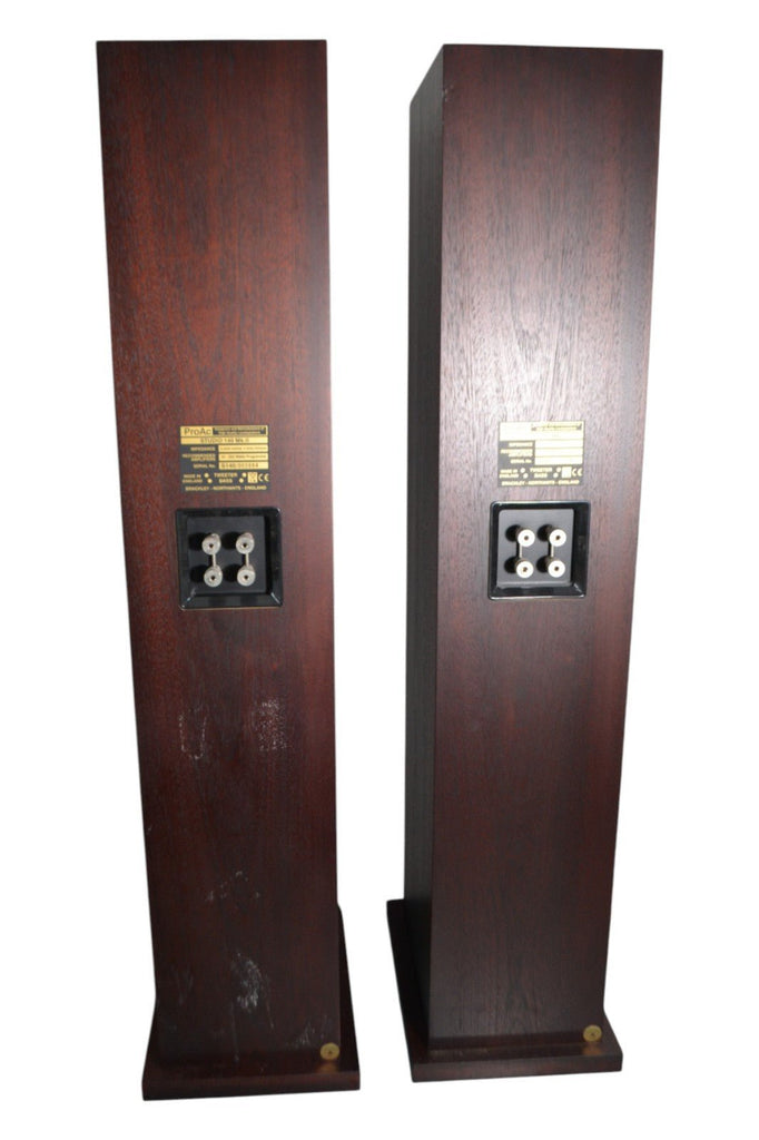 ProAc Studio 140 Mk2 Floorstanding speakers. Excellent cosmetic condition and in full working order. Really nice fresh looking and sounding drivers. Previous elderly couple owned them from new. Grills are present and also in good condition. We've had custom boxes made to ship these in. Delivery is free for mainland and non remote UK. If in doubt please ask as we will do what can to find a solution but we cannot do free delivery to locations deemed remote by couriers without prior negotiation. There are a few marks on the back of one speaker from cable having previously being taped there. Please see the detailed photos. Spikes are included (not presently fitted).