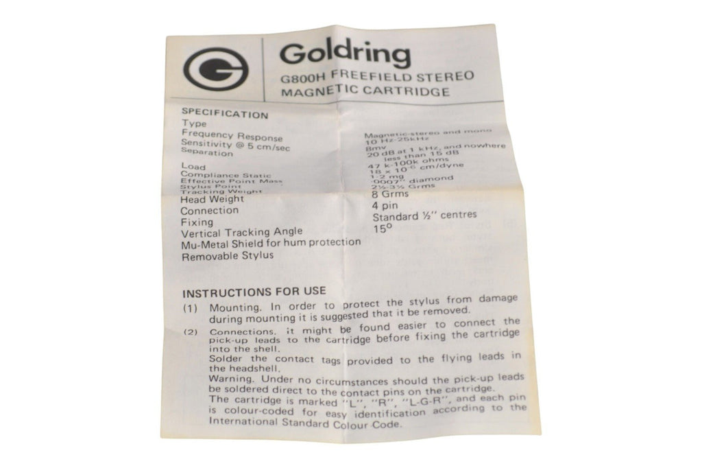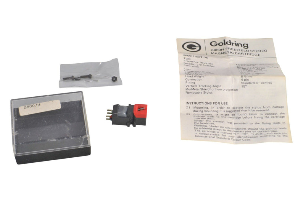 Classic Goldring G800H turntable cartridge. Original boxed with mounting hardware. Inner case only no outer pacakging. The cartridge has been play tested and has strong output on both channels. The cantilever is straight and the stylus is clean and present. Hours unknown but it looks pretty fresh.